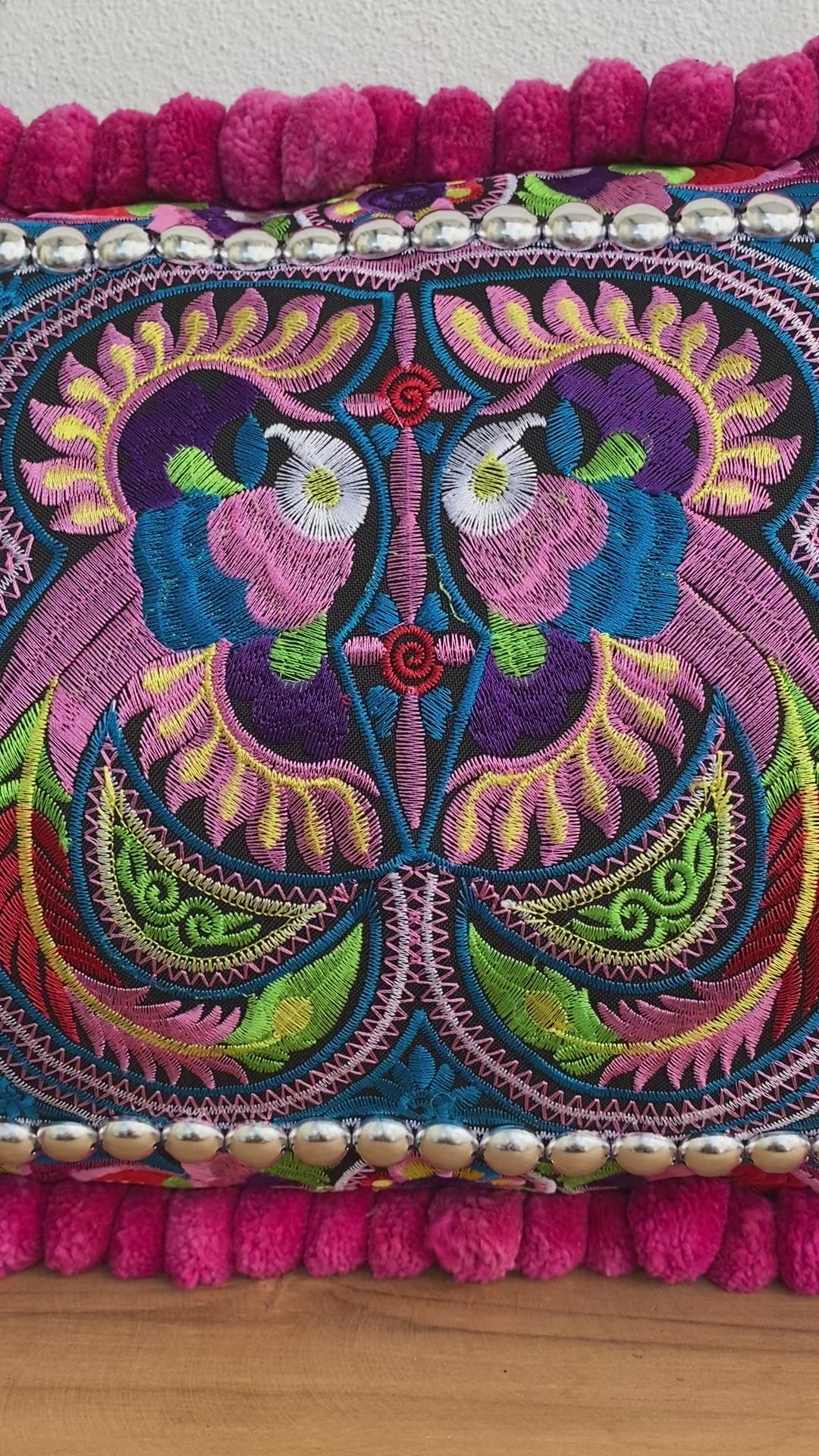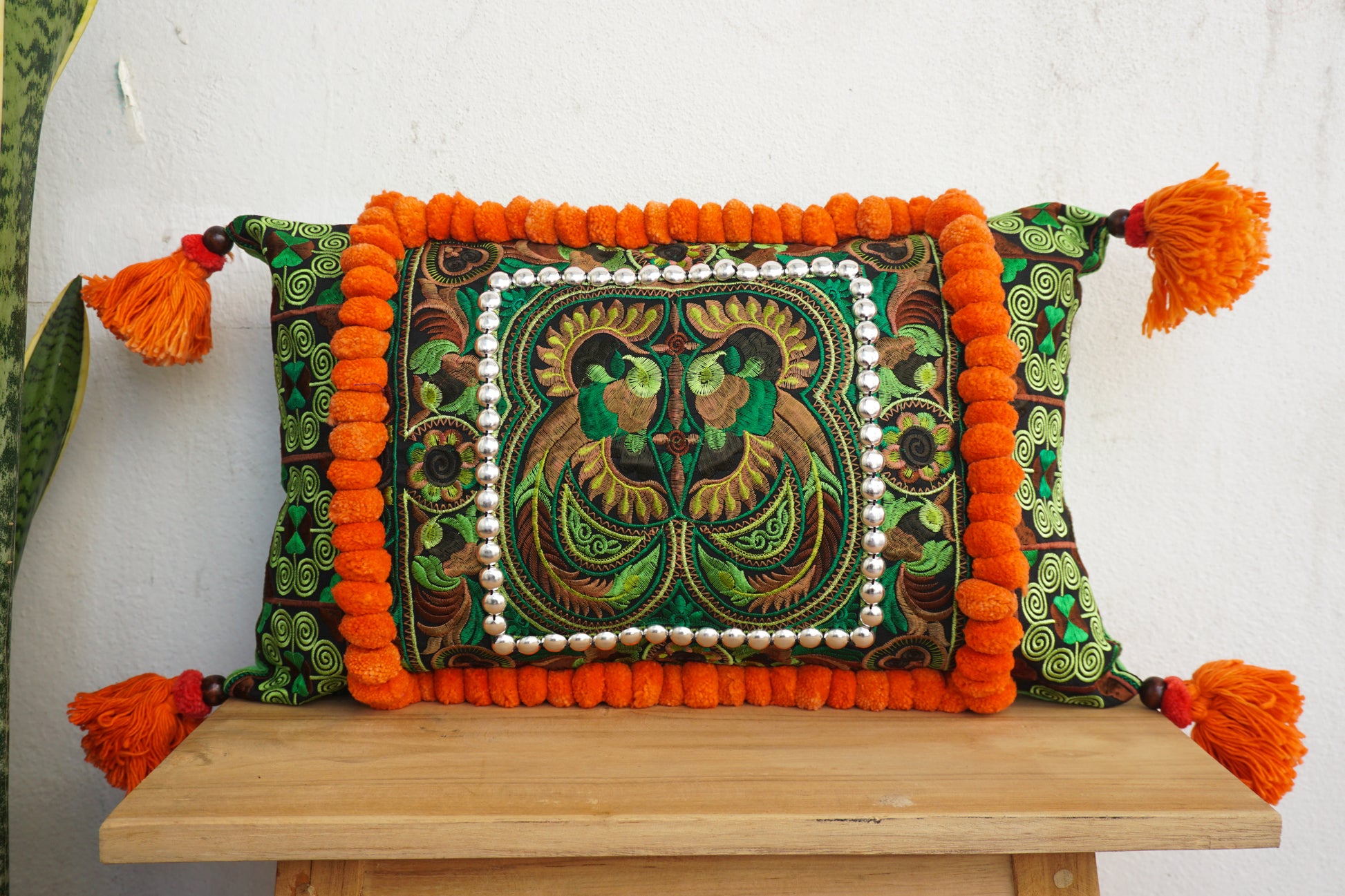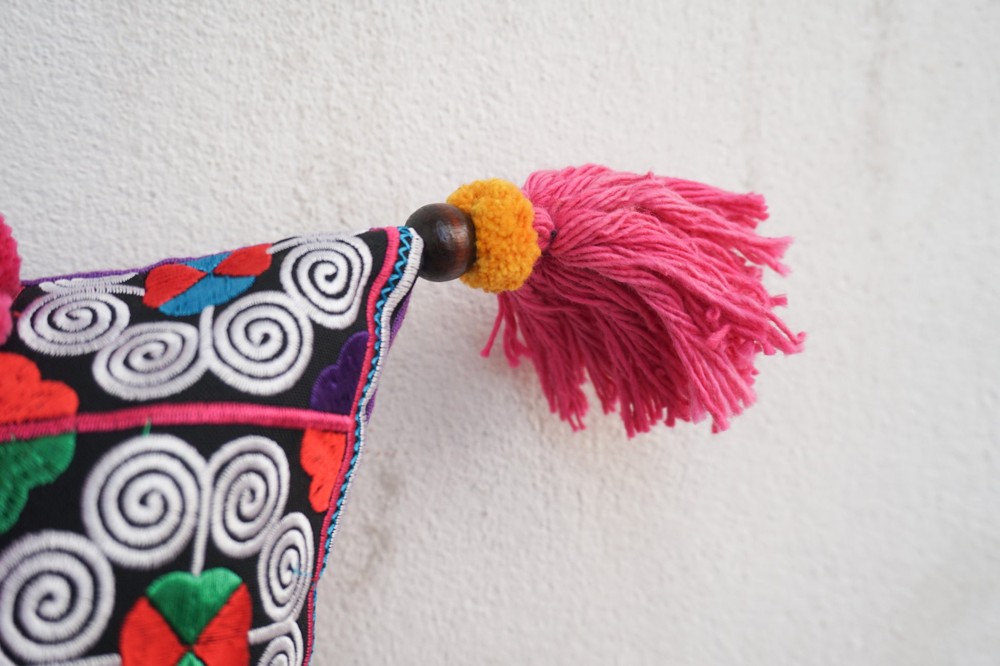 12x20 Hmong Cushion Cover with Tassels, Pom Poms