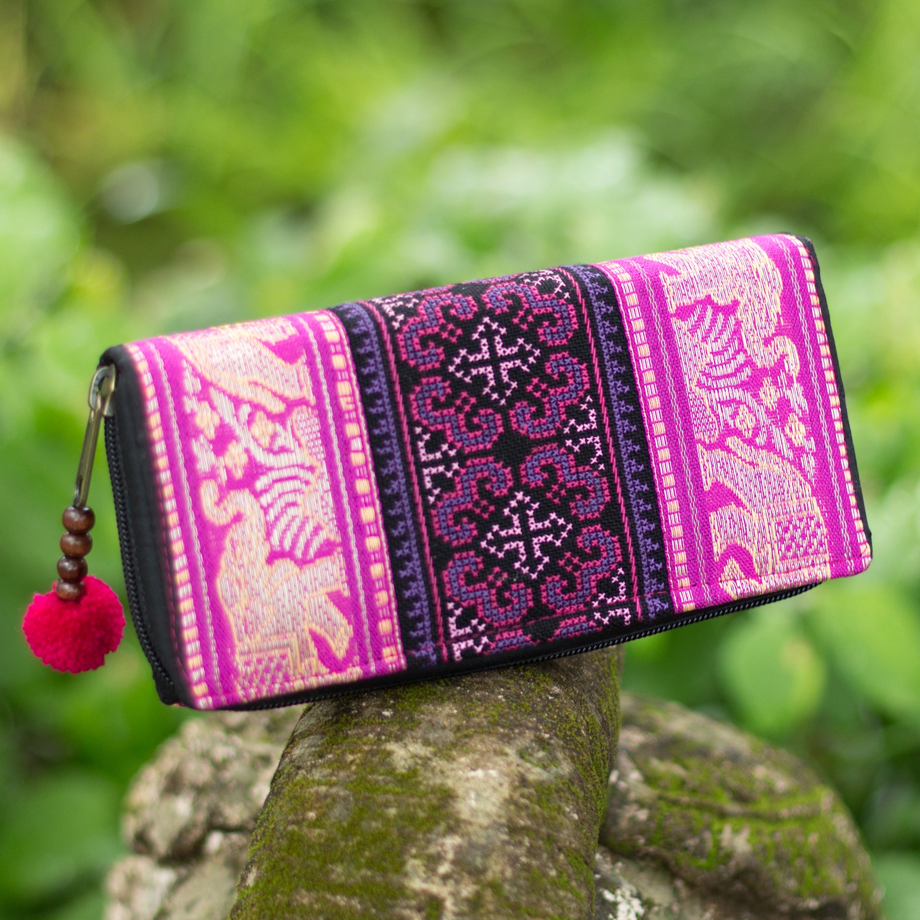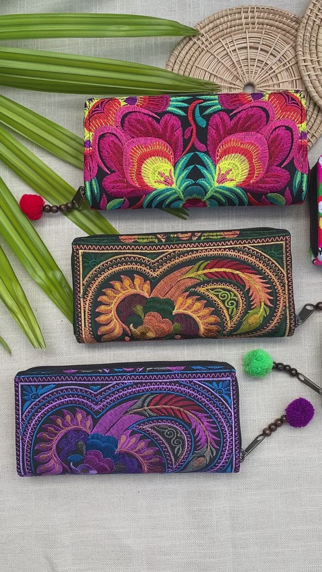 The beautiful bag is made with an amazing piece of fabric woven by the HMONG hill tribes of Lanna Country (Northern Thailand). It feature this wallet with cute pom pom pull zipper. Inside there is one zippered pocket and 8 card slots.